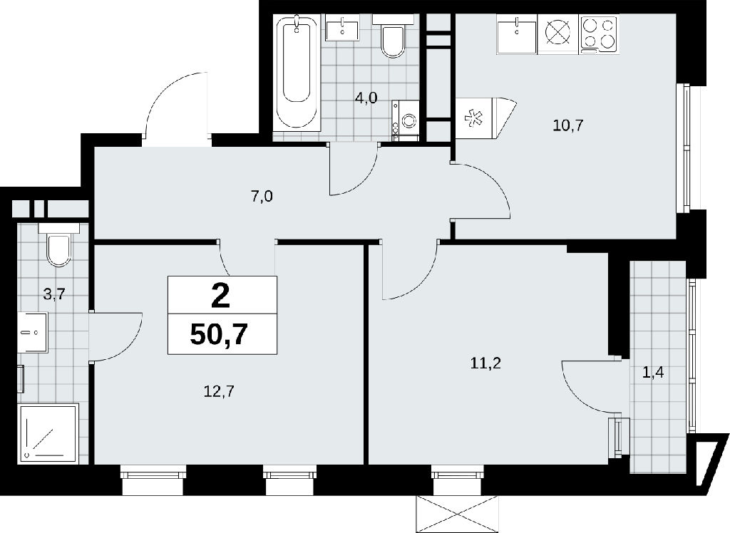 Продаю двухкомнатную квартиру площадью 50.7 кв.м., без отделки, на 13 этаже из 16 в жилом комплексе комфорт-класса "Прокшино". Угловая квартира, такая планировка отлично подойдет всем любителям панорамных видов и тишины. В квартире одна лоджия, два совмещенных санузла. Высота потолков 2.95 м.